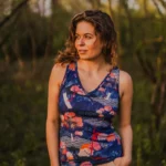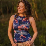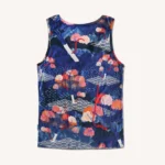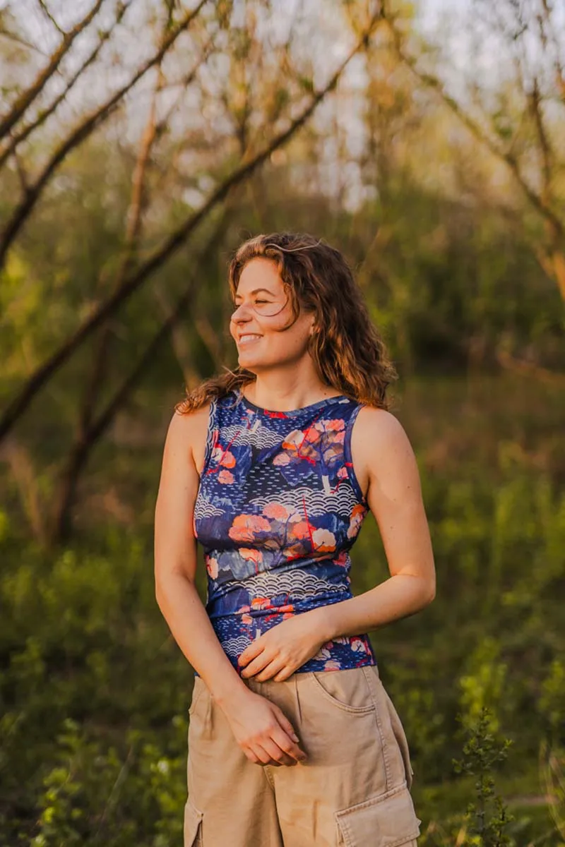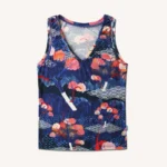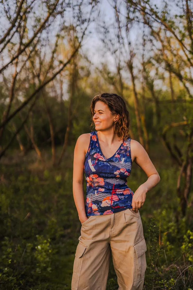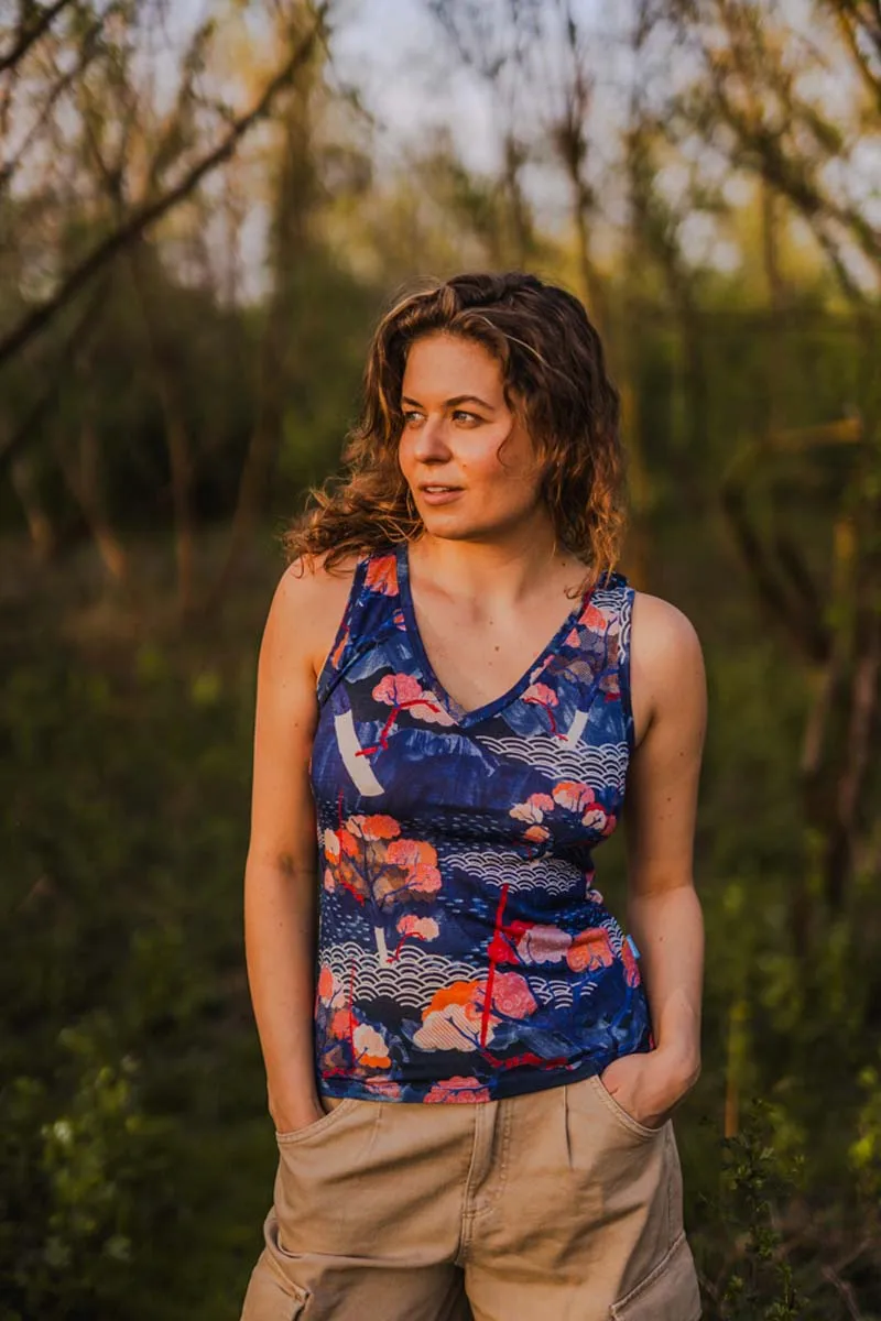 Koszulka bez rękawów z wełny merino we wzór tengoku z dekoltem V. Top z wełny merino delikatnie taliowany, dopasowany, ale nie obcisły. Kiedy go założysz, nie będziesz go na sobie czuć.